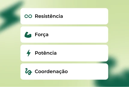 Escolha coordenação, força, potência ou resistência. Ajuste séries, repetições e descanso.